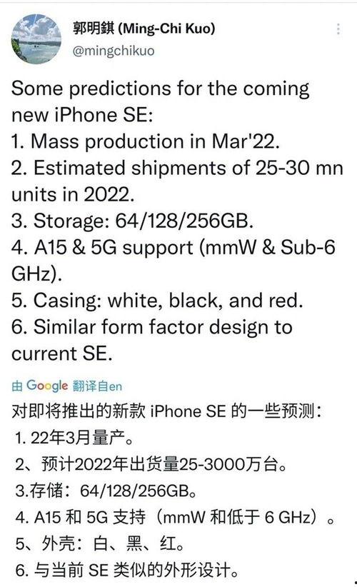 说到郭明錤,不得不提他在科技界的地位。作为一位资深的科技分析师,郭明錤凭借其敏锐的洞察力和准确的预测,被誉为“科技界的预言帝”。他的每一次爆料都备受关注,而这次关于SE3的爆料也不例外。
